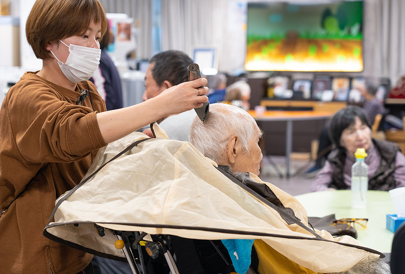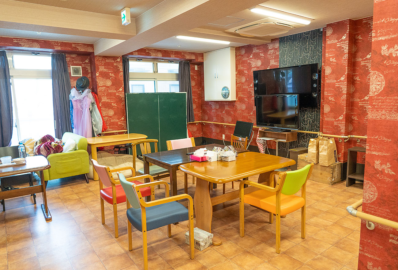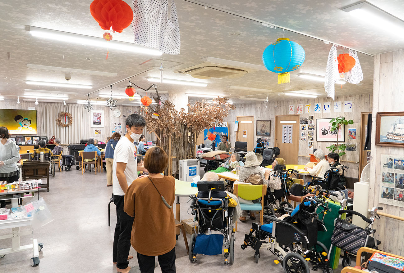 確かに高齢者の施設っぽくはあるけれど、老若男女が入り乱れ、ぱっと見では入居者かどうかもわからない人も多数。奥ではパソコンで作業している人も居るし、電動雀卓を囲んで喋っている人も居る。まさに「ごちゃ混ぜ」。